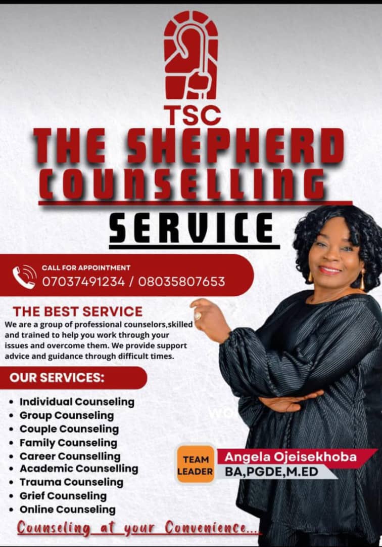 Mrs Angela Ojeisekhoba, i cannot begin to tell you how grateful i am already. You are an amazing person, with a tremendous character and a fantastic Counselor, a leader, trust worthy and encouraging. The association you have set up is such a blessing to so many and i want to pass on my appreciation and compliments. Before I started therapy sessions with Mrs Angela Ojeisekhoba I was depressed but The Shepherd Counseling service helped me identify the causes of my depression and also helped me find the tool and confidence to overcome it. I highly recommend The Shepherd Counseling service, not only because they are good but also every session is worth diamond.